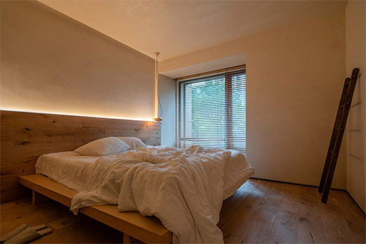 所以設計師根據房間主人的閱讀習慣,利用吊燈作為作業照明安裝在了床頭,吊燈的角度并根據主人的看書姿勢進行了調整;