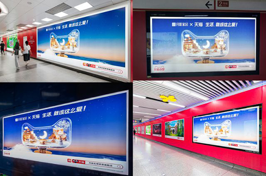 除了華潤小徑灣的“世外桃源小燈泡”快閃活動,大家還可以在地鐵燈箱看到月影家居和天貓618聯合的“貓頭”形象。