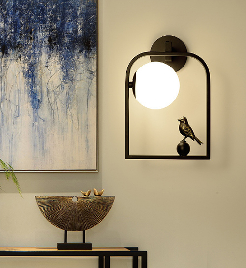 壁燈采用簡約的幾何造型設計,方圓結合,剛柔相濟,鳥兒置于深色鐵藝燈架之中,打破其既定格局,望向一輪懸在高空的圓滿明月,寓意美好團圓。