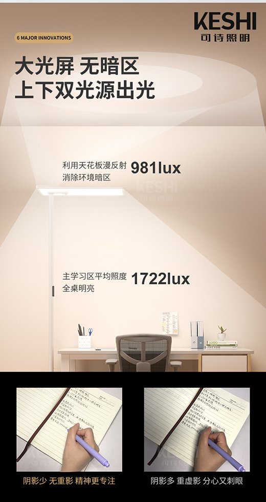 經(jīng)過測試,該燈具提供的照度能達到全桌明亮,其中上發(fā)光利用天花板的漫反射有效消除環(huán)境暗區(qū),如我們所見,雙光源出光讓書桌整體更光亮。