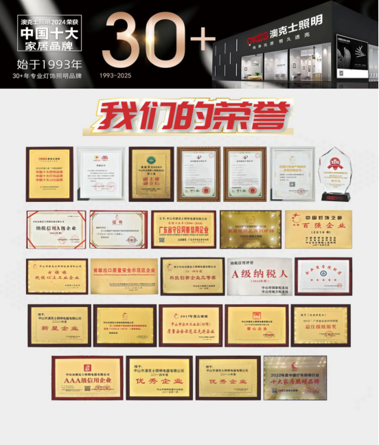 澳克士照明扎根中山古鎮(zhèn)燈都,從1993年建廠,發(fā)展至今已30多年,先后榮獲“廣東省守合同重信用企業(yè)”“古鎮(zhèn)鎮(zhèn)規(guī)模以上工業(yè)企業(yè)”、“十大家居照明品牌”、“中珠江澳十大牛商”等各項殊榮,作為與澳克士照明共同成長的經(jīng)銷商,在企業(yè)發(fā)展的過程中,不管是品牌戰(zhàn)略布局,還是技術(shù)創(chuàng)新培育,以及市場攻堅克難,都離不開他們的陪伴與堅守。