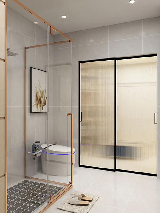 ▲入門(mén)選擇了極窄雅黑邊框+超白長(zhǎng)虹玻璃的M1A全景門(mén),朦朧感的玻璃既保護(hù)了隱私,又增加了空間的美感,讓浴室生活變得趣味十足。