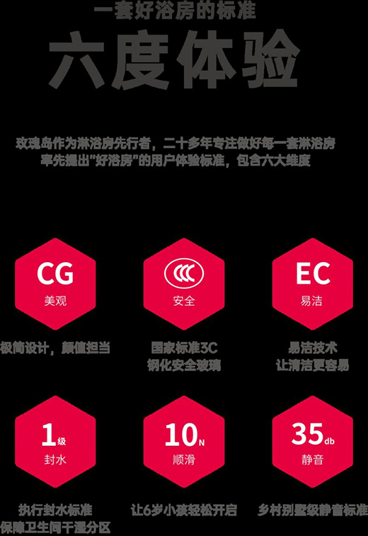 一直以來,玫瑰島肩負著“讓天下人洗好澡”的使命感,致力于提高淋浴房的使用體驗,為更好地滿足用戶需求,玫瑰島率先提出了“好浴房”的六大標準:美觀、安全、易潔、封水、順滑、靜音,這也是消費者在選購淋浴房時常用的參考指南。