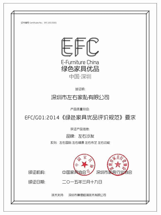 綠色優品,是幸福的底線早在2015年,左右沙發便成為首批獲得“中國綠色家具優品”認證的四家企業之一,也是唯一一家沙發品牌。