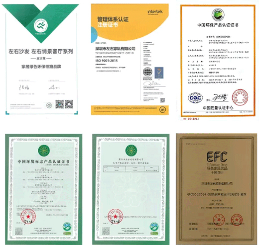 憑借嚴格的生產質檢標準,左右沙發已連續6年獲得“綠色家具優品”認證,同時還通過了多個國家級專業認證,構建起從綠色園區、綠色工廠和綠色產品三位一體的綠色制造體系,讓您買的放心,用得安心。