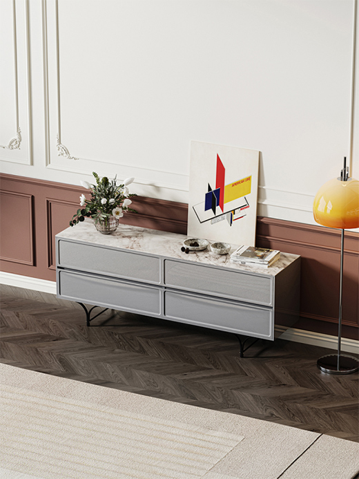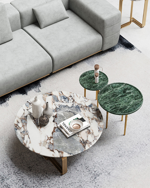 這款茶幾最大程度地協(xié)調(diào)了觀賞性與實用性,桌面采用紋路清晰多樣的大理石,著重展現(xiàn)時間的痕跡。金屬桌角采用三棱柱的形態(tài),三角支撐更加牢固,茶幾整體展現(xiàn)出穩(wěn)重奢華的特質(zhì),當(dāng)有燈光照射時,便會展露出溫潤的光澤感,從而激發(fā)人們對美好生活品質(zhì)的向往。