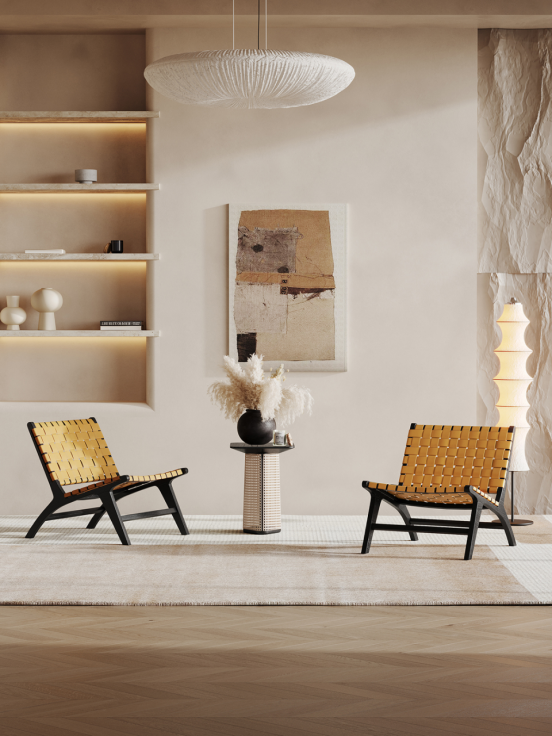 客廳,作為家居環境中出鏡率最高的地方,營造清爽宜人的客廳空間尤為重要。在客廳布置的時候,選用洛品有家侘寂系列家具。比如藤質休閑椅,置于屋內一角,搭配綠植裝飾,清新自然中又透出古樸沉穩的意境,對避暑相當有益,是休息及會客的特色空間。