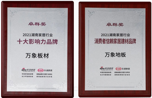 1月9日,以“以匠心 致美好”為主題的2021第五屆湖南家居產業發展峰會暨“卓群獎”頒獎盛典在長沙君悅酒店舉行,這是一場立足當下,放眼未來,為2022年家居行業全域賦能的盛宴。萬象品牌產品萬象板材、萬象地板分別獲得2021湖南家居行業十大影響力品牌獎項、2021湖南家居行業消費者信賴家居建材品牌獎項。