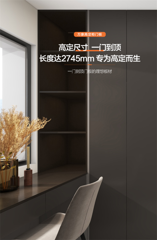 萬象健康板材ENF級高定柜門板區(qū)別行業(yè)傳統(tǒng)的柜門板產(chǎn)品,其長度達2745mm,比市面上普通產(chǎn)品長305mm,是一門到頂門板的理想板材,整體高端大氣、簡約美觀,呈現(xiàn)出與眾不同的視覺體驗。