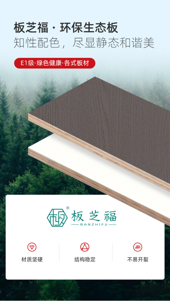 多年來,板芝福始終致力于用卓越領先的工藝完美可靠的品質,讓千萬家庭享受更加幸福安心的生活。主營產品涵蓋生態板、家具板、阻燃板、歐松板。公司暢銷產品——七合多功能生態板,突破普通多層生態板的常態,以新國標ENF環保等級為基準,擁有耐磨、耐刮、阻燃、防水、防蟲防蟻、抗變形等特性。產品先后通過 ISO9001質量體系認證、 ISO14001環境體系認證、EPA認證、CARB 認證、FSC 認證。
