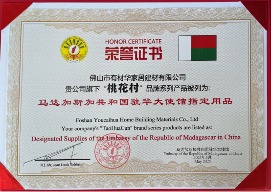 近日,佛山市有材華家居建材有限公司旗下“桃花村”品牌系列產品正式被列為“馬達加斯加共和國”駐華大使館指定用品,以東方匠心贏得國際認可。