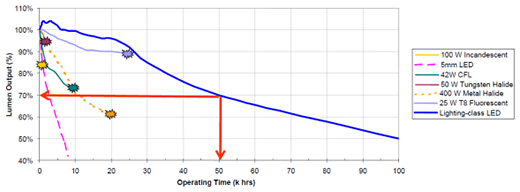 所有的傳統(tǒng)光源的性能都會隨著時間的推移而退化(輸出流明值降低),即使是LED也是如此。傳統(tǒng)光源的失效,往往是因?yàn)闊艚z工作一段時間后開路而導(dǎo)致不能再使用;而LED在驅(qū)動設(shè)計合理的條件下(恒流驅(qū)動),退化非常緩慢,使用壽命遠(yuǎn)遠(yuǎn)大于傳統(tǒng)光源。