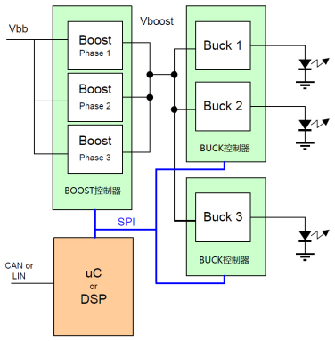 LED工作過程中,發(fā)熱量大,溫度影響著它的各個參數(shù),這就要求LED驅(qū)動應(yīng)該使用恒流源。實(shí)際應(yīng)用中,不同的LED有著不同的參數(shù),再加上不同照明方式的設(shè)計要求,很難找到一個通用的設(shè)計方案去匹配。安森美為車用大電流的LED驅(qū)動提供完整的解決方案,使用的是BOOST-BUCK的拓?fù)洌⑶腋髌骷?shù)均可通過編程配置,如圖 2所示,先升壓后降壓,可滿足各種不用應(yīng)用的設(shè)計,特別是汽車前照燈方面。