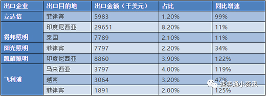 根據GGII統計顯示,2018年末,在國內前十照明出口企業的出口目的國中,僅佛山照明出口涉及到了馬來西亞、菲律賓等東南亞國家,且增幅不大。但到了2019年,立達信、得邦照明、陽光照明、凱耀照明、飛利浦等企業出口越南、泰國、菲律賓、印度尼西亞的產品金額均有顯著增長。