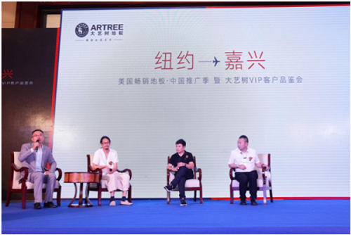 簽約儀式后,現場舉辦了一場精彩的嘉賓論壇。大藝樹邀請到了嘉興市家居裝飾裝修協會秘書長陸明強先生、嘉興星藝裝飾總經理周雪輝先生、嘉興紅星美凱龍商場總經理吳向標先生,共同上臺就大藝樹地板的產品風格、及當下的家裝趨勢進行了深入的交流。