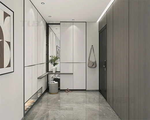 入戶空間一側是木飾面,另一側白墻+嵌入式入戶柜,其中入戶柜大面積采用白色,中間增加了灰色的隔板作為柜面,放上植物,簡單中還充滿生機。
