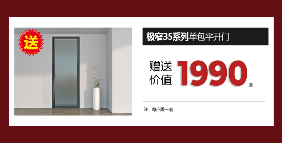 活動期間,消費者選購任意系列窗戶下定金20000元以上,即可贈送價值1990元極窄35系列單包平開門一套,每戶限一套,此優惠不與特價產品重疊。