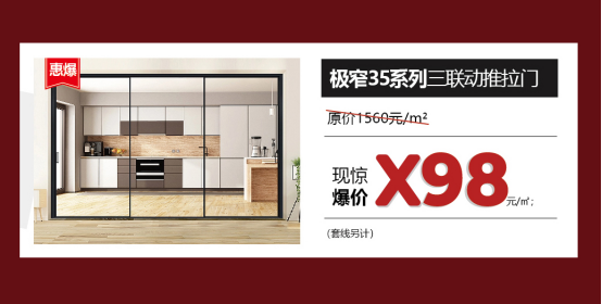 爆款優選,極窄系列三聯動推拉門,原價1560元/㎡,現驚爆價X98元/㎡。精雕細節,性能優異,摒棄繁瑣的裝飾,賦予窗戶獨特的藝術。