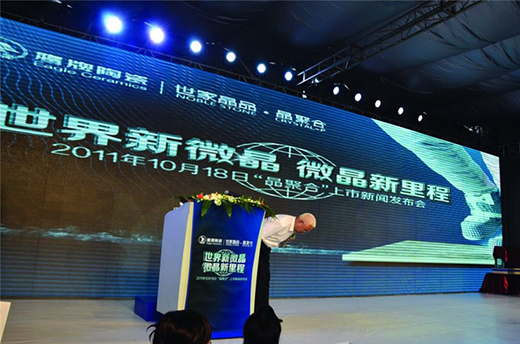 晶聚合新品發布會上,時任中國陶瓷工業協會理事長何天雄先生向鷹牌深情一鞠躬