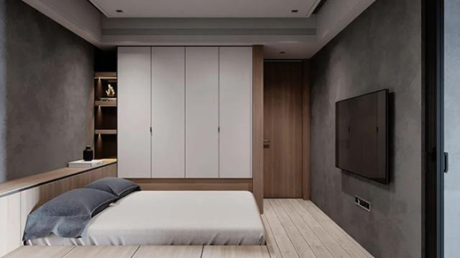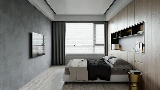 臥室的陳設,在黑白灰間穿梭,光影層疊的交替,還原了材料本身的質感。色調的層層推進,讓空間更有層次感色。