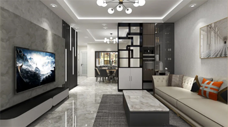 瓷磚挑選與喬瓦尼·斯達克相仿的色彩,自然融洽的設計讓空間瞬間拉升高度。遵循色彩搭配原理,沙發背景墻選擇鉛灰色,為在視覺上擁有更強的層次感,GIOVANNI喬瓦尼·西西里砂絨藝術涂料成為設計師的首選。西西里砂絨(點彩)的肌理更為細膩柔和,在燈光下可閃現點點亮光,有置身于舞臺中央起舞的動感。軟裝上色彩多以黑灰、米白、黑白點綴,營造和諧的生活空間。