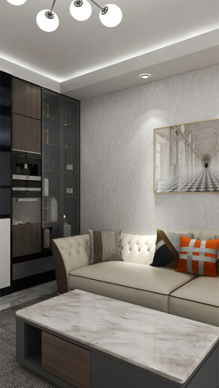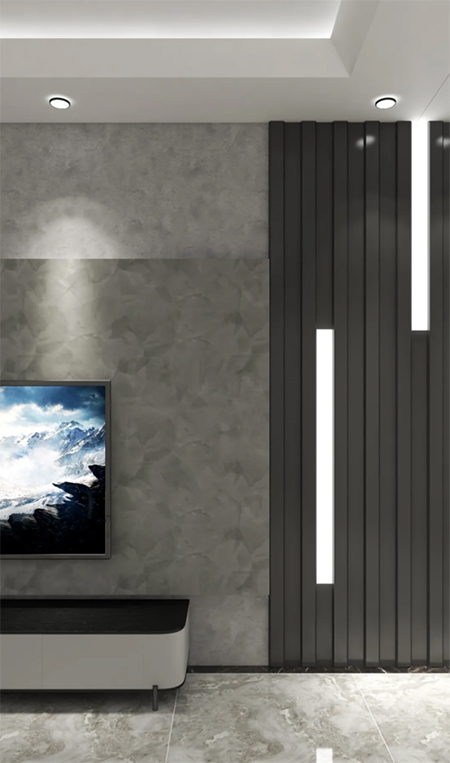 抓不住的風,只適合遠方,作為舞者的業主,追求輕盈、空氣感的空間氣氛。設計師利用灰色旋律展現其跳躍、自由、舒適的居住氛圍。電視背景墻使用GIOVANNI喬瓦尼·斯達克及拉斐爾藝術涂料,現代與夢幻的立體效果,營造舞動空間的浪漫節拍。“我將空間比作一個整體,它是統一的,但他也是自由的。利用深淺度不同的灰色涂料,斯達克藝術涂料的硬朗直接,與拉斐爾(天鵝絨)藝術涂料的柔和飄渺,像業主在云端翩翩起舞,優雅高貴,個性鮮明。”