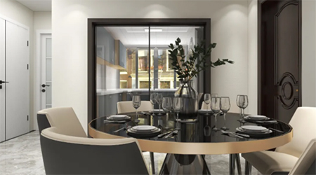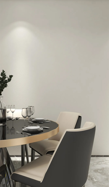 “我將他們的家比作舞臺,那么餐廳我希望設計成聚光燈。它的主角是舞者,配角是餐椅,而墻面一定是聚光燈。”設計師根據業主的要求及工作性質,為餐廳打造了一個純色的現代極簡空間。舞蹈是一份藝術,它充滿想象與愉悅,GIOVANNI喬瓦尼·威尼貝斯藝術涂料,選用百合灰色彩,介于米白與淺灰,營造獨特的空間風格,讓業主感受到色彩賦予空間的靈氣;威尼貝斯的光澤柔和,手感細膩,在純色的閃耀下更顯精致簡約,是年輕人極為喜愛的效果。