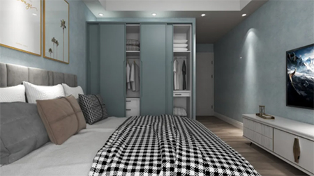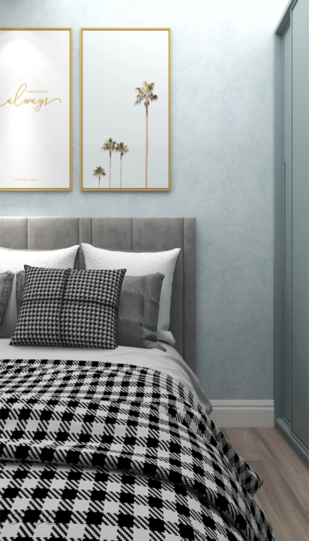 如何體現臥室的敞亮感?輔助色選用白色,包括電視柜、踢腳線及墻面上的兩幅掛畫,床上四件套則是使用經典黑白灰搭配,營造臥室干凈、舒適、溫柔的空間個性。喬瓦尼·托斯拉可以在不同的光線下折射出不一樣的色彩變幻,業主在此空間適合放空大腦,放松身體,享受寧靜的夜晚。