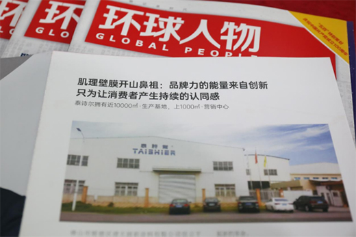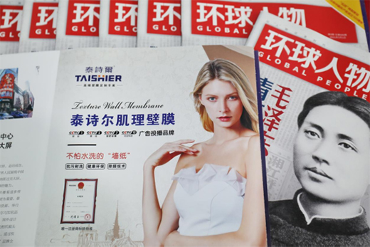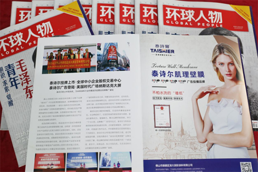 在最新一期《環球人物》上,封面處用較大的版面向眾多讀者介紹了佛山市順德區清大潤彩涂料有限公司旗下品牌“泰詩爾”不僅是肌理壁膜創始者、肌理壁膜商標專利持有者,更是我國唯一一家出口海外的藝術涂料品牌,在業內擁有廣泛的知名度和影響力。其壁膜漿+工藝構成的肌理壁膜裝飾效果酷似墻紙,但它與墻紙不同的是更為環保、更加節能、更持久耐用,性價比更具優勢,并能克服一般涂料及墻紙普遍存在的各種弊端。它具有綠色環保、耐水防霉、附著力好、經磨耐擦、裝飾性強、施工簡便等特點,是一種集高新科技與高雅藝術為一體的新型墻面裝飾產品,它的問世必定成為墻面裝飾藝術的新潮流。