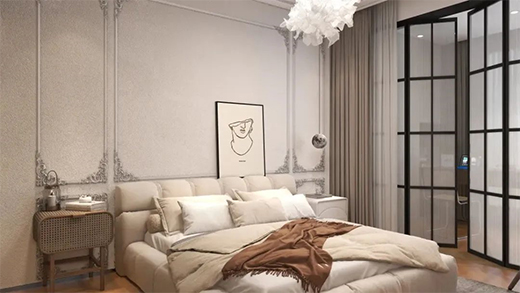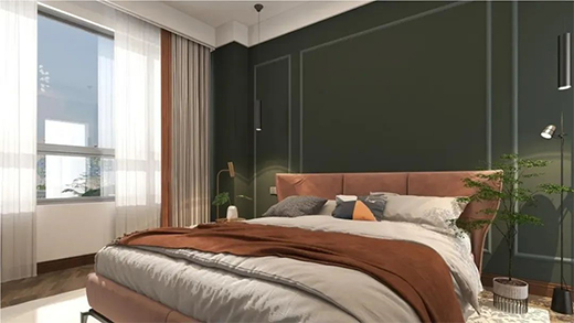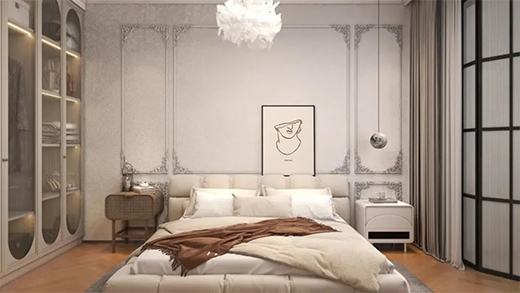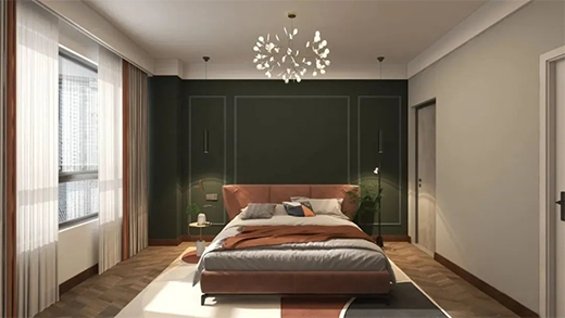 客房相對(duì)于主人房會(huì)更加沉穩(wěn)內(nèi)斂,暖白與苔蘚綠搭配和諧了整個(gè)空間,使空間更有層次感,營(yíng)造了一個(gè)唯美的臥室環(huán)境。