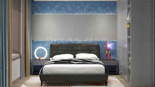孔雀藍色背景與米灰色的裝飾搭配,沒有太多復雜感受,讓布局更加簡單了,童年就是如此干凈純潔。