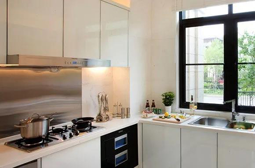 在廚房灶臺墻面的選材上,更多地考慮大塊、平整、深色的瓷磚,可以減少接縫處藏污納垢;或者使用整塊不銹鋼墻面,油漬一擦即除,還能避免墻面變色。