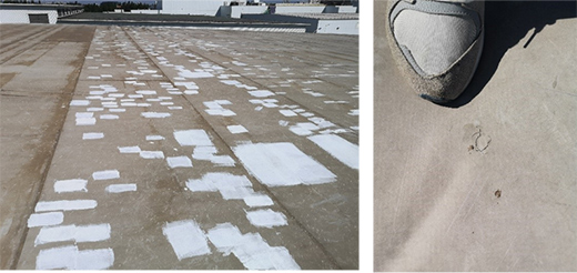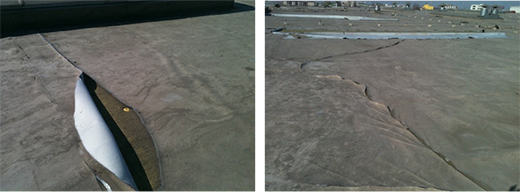 該項目,使用帶纖維背襯的聚氯乙烯防水卷材。由于沒有內增強織物的存在,無法有效的將機械固定件的點荷載分散成面荷載。當遇到強風時,尤其是在冬季寒冷天氣,卷材較之高溫天氣變的硬脆后,直接造成卷材撕裂破壞。類似的情況也會出現在把均質型產品用于大面機械固定。這也體現了有無增強織物,以及增強織物采用無紡布還是編制織物的作用機理差異。
