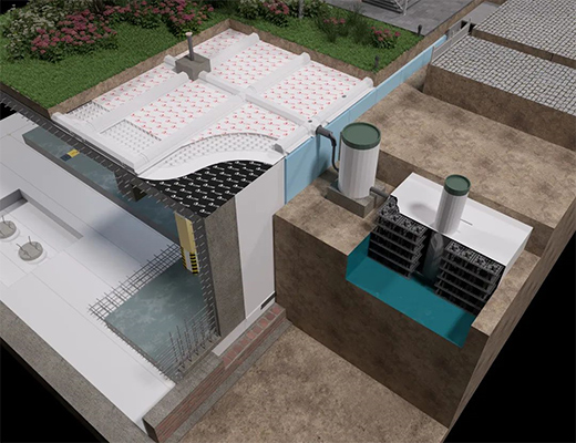 系統能夠有效解決傳統地下建筑種植頂板/屋面排水不暢、竄水、滲漏等痛點,并借助防水、保溫、隔熱、滲水的循環利用,將收集的雨水用于植被澆灌等。既提升了對地表水的循環利用,讓水在城市中的“遷移”活動更“自然”“順暢”,又為生態環境建設增添了亮色,實現綠色環保,節約水資源的效果,使“防水-排水-園林綠化”融為一體,實現和諧共生的綠色低碳發展模式。