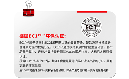 獲得了全球最嚴環境認證之一的德國EC1plus認證標志,產品揮發物濃度低至60ug/m3,超強環保性能,即使是嬰幼兒也不會造成傷害。