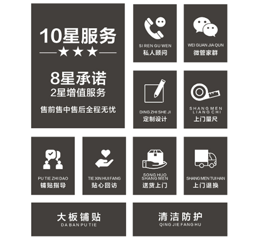 為消費者提供全程無憂的10星服務,8星承諾、2星增值服務:從私人顧問、微信家群、定制設計、上門量尺、送貨上門、上門退貨、鋪貼指導、貼心回訪、大板鋪貼、清潔防護等環節全程跟蹤,為消費者提供系統化的購物服務與體驗。