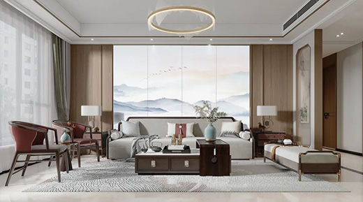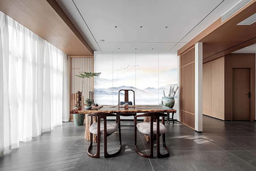 青山含遠黛,白云空自流,朦朧的遠山,籠罩著一層輕紗,影影綽綽,在飄渺的云煙中忽遠忽近,若即若離,就像是幾筆淡墨,抹在藍色的天邊。畫面中淡墨遠山,若隱若現(xiàn),霞影絢爛,賦予空間靜謐雅致的意境。