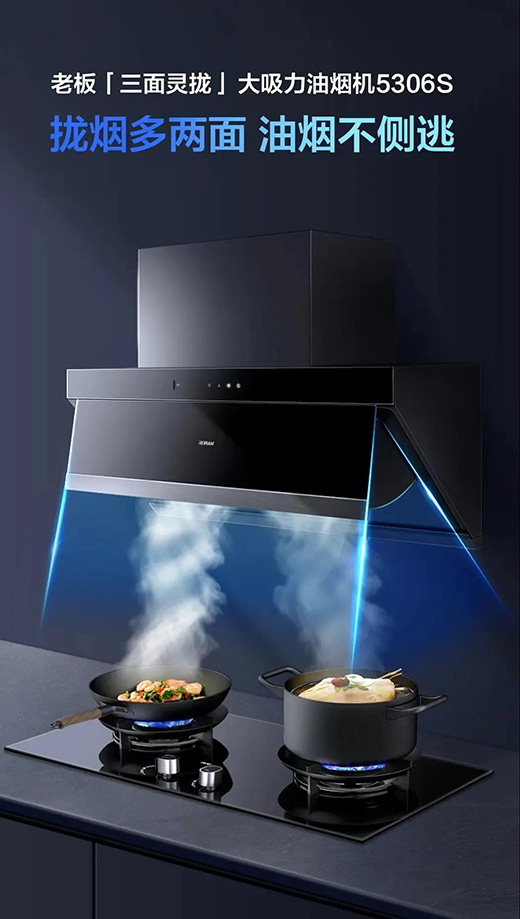 老板電器專注中式烹飪,致力解決中國家庭的廚房難題,潛心研發(fā)老板三面靈攏大吸力油煙機5306S,攏煙多兩面,徹底改寫油煙側逃歷史!