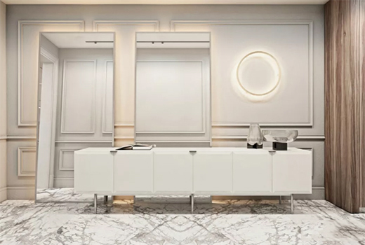 臥室外的走廊背景墻色調給人優雅靜謐之感,灰色線條裝飾豐富背景墻層次的同時烘托精致氛圍。