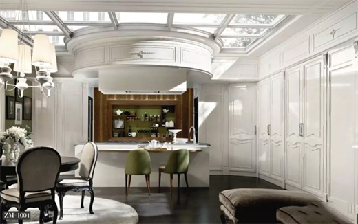 造型吊燈豐富空間形態,長桌打造美式韻味,一字型操作臺面節約空間,令餐廳不再擁擠。