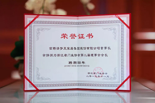 本次峰會上,浙江省門業(yè)協(xié)會同時舉辦了第二屆理事會換屆儀式,夢天家居集團董事長余靜淵先生連任浙江省門業(yè)協(xié)會第二屆理事會會長。