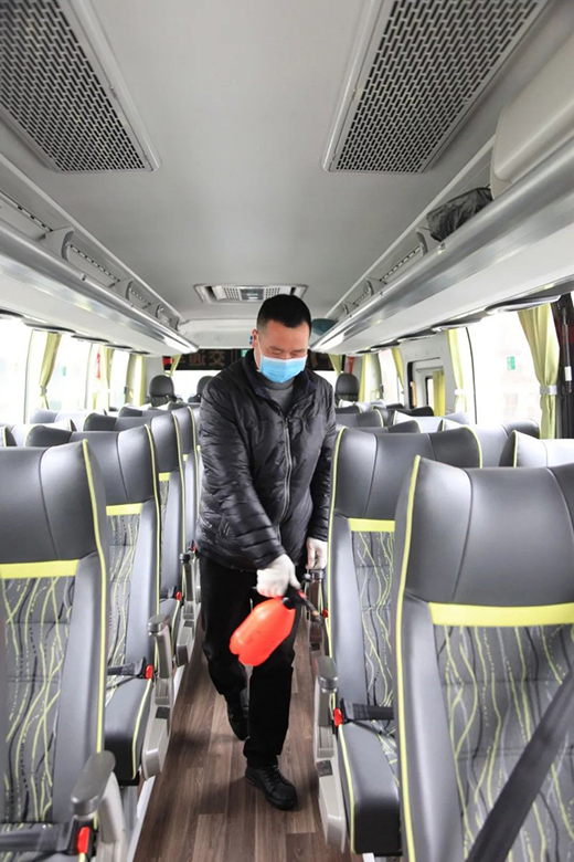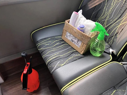 李師主要工作是駕駛公司交通車,負責(zé)每天接送員工上下班。當(dāng)下為了做好新冠肺炎疫情防控工作,李師5點過就得起床提前做好一系列的防護。先是和尋常一樣對車進行安全檢查,確保安全無患;然后給交通車內(nèi)外全面消毒消菌,保證防控到位。雖然交通車每天就承載員工上下班的幾十分鐘,李師卻要消毒三次,每一個座位、每一處扶手都細心全方位的消殺,不放過每一處細節(jié)。