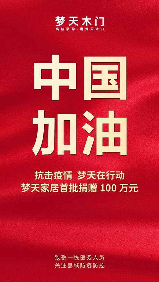 時下我們正經受著嚴峻的考驗,無數醫務人員與防疫工作者正日以繼夜守護著生命防線。防控疫情,人人有責,夢天集團這一義舉只是國內木門英勇抗疫的一個縮影。事實上,自疫情爆發以來,還有大量木門企業責無旁貸鼎力支援抗疫前線,這其中包括TATA木門、鑫迪木門、金迪木門、千川木門、展志天華等一批木門企業以各種形式捐款捐物,助力抗疫一線。眾志成城,戮力出戰,一股股愛的暖流凝聚成打贏疫情防控阻擊戰的強大力量,相信我們最終會打贏這一場沒有硝煙的攻堅戰,奪取疫情防控阻擊戰的最終勝利,嚴冬過后定是春暖花開。