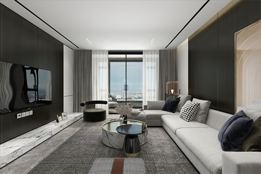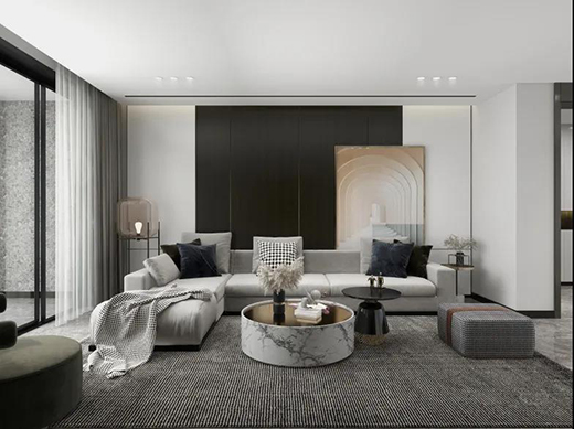 在整體墨本色的基調下,白色和沉靜灰色做軟裝陳列擺設。即使是不加雕飾的背景與無吊燈的頂部設計,也利用了小擺件與色彩搭配營造出了簡潔大方的層次感。灰白色布藝沙發和茶幾呈現出弧線,上面隨意擺放幾個夜空藍與黑白格相間的靠枕,再搭配兩個圓形茶幾,簡單的幾何元素就能營造出豐富的空間質感。