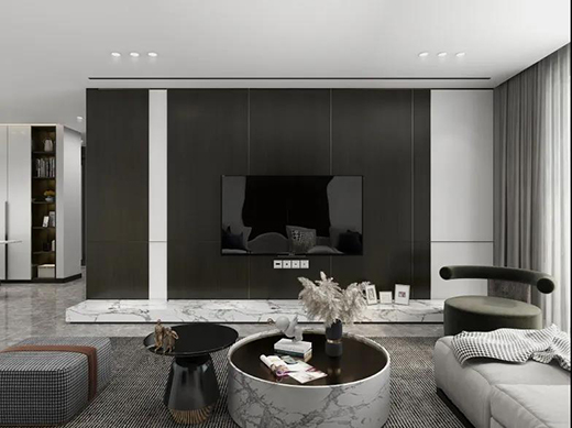 電視背景墻依舊對應沙發背景墻,下側是大理石面的置物區,墨本色、大理石紋與金屬擺件的配合,藝術又開放的切換,充滿立體效果。