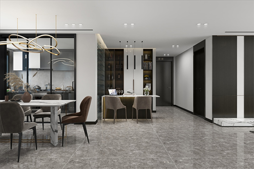 客廳與餐廳之間自然銜接,傳遞區域之間的空間關聯。吊燈則采用了金屬燈飾,與大理石桌面在視覺上形成了角度的匯合,呼應整體的簡潔藝術感。并且餐桌與工作區相鄰,增加互動性同時也更有煙火氣息。而廚房選用了TATA木門極簡玻璃推拉門讓空間更有整體美觀度。