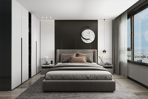 主臥空間以灰與白作為色調主角。床頭背景墻則選用了墨本色作為平鋪,點綴的圓形裝飾營造出臥室簡潔的舒適感,整體灰色與藕粉色的床品降低了色彩存在感,讓一切重心歸于舒適安逸。