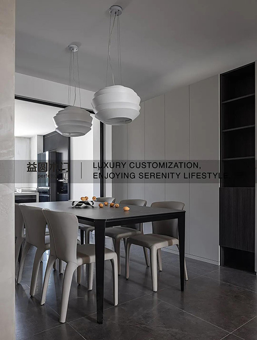 將公共空間的收納更多集中在餐廳的一側,保持恰當的體量,兼具遮物和陳列兩種功能,柜門留白最大限度讓表明平整無飾,讓空間在視覺上更充裕。