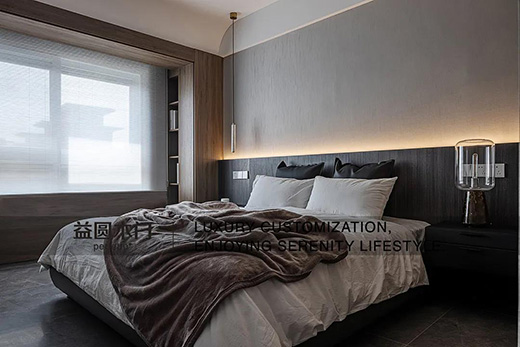 柜體與床頭墻面的木色特地選擇有色差的材質,拉出層次,避免連成片的深色一不小心就會太過沉穩,床笫之間,一切的放松都與木質關聯。