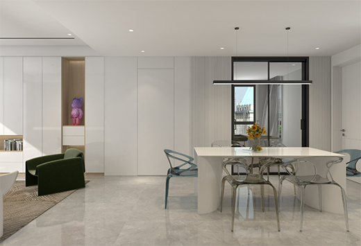 作為客廳視覺延續的開放式廚房,餐桌選擇與整屋裝修色調統一的白色,以亮眼的桌椅點綴空間,使整個餐廚區域與客廳區域更加協調。